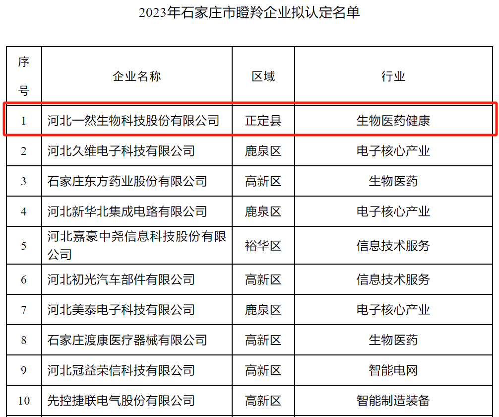 根据《石家庄市瞪羚企业认定管理办法》,市发展改革委组织开展了2023年瞪羚企业认定工作。经市委、市政府研究决定,对河北oety欧亿体育生物科技股份有限公司等34家企业授予2023年石家庄市瞪羚企业奖牌,并对其中27家企业予以奖励扶持。34家瞪羚企业包含生物医药产业11家,新一代电子信息产业9家,智能装备制造产业8家,新材料4家,先进环保2家。 据悉,这是河北oety欧亿体育生物科技股份有限公司荣获“2022年石家庄市瞪羚企业”后,再次获得此项荣誉。